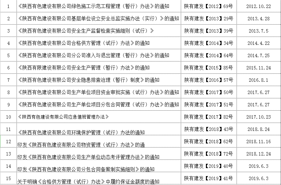 三、公司管理體系制度不斷完善健全。制定了《陜西有色建設有限公司安全生產(chǎn)管理手冊》《陜西有色建設有限公司文明施工、綠色施工管理手冊》《陜西有色建設有限公司VIS企業(yè)視覺識別系統(tǒng)》。