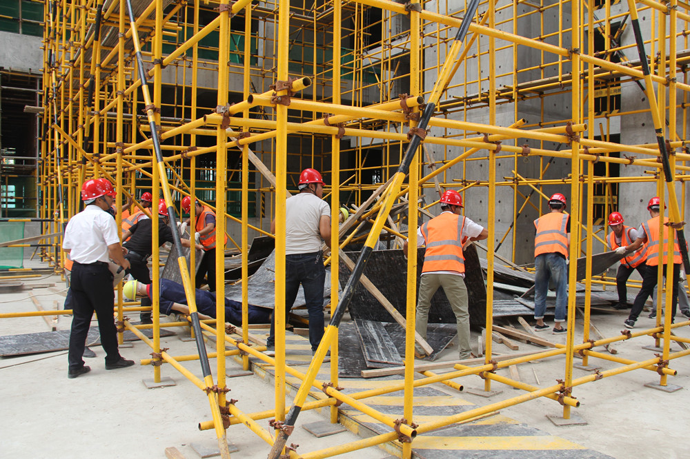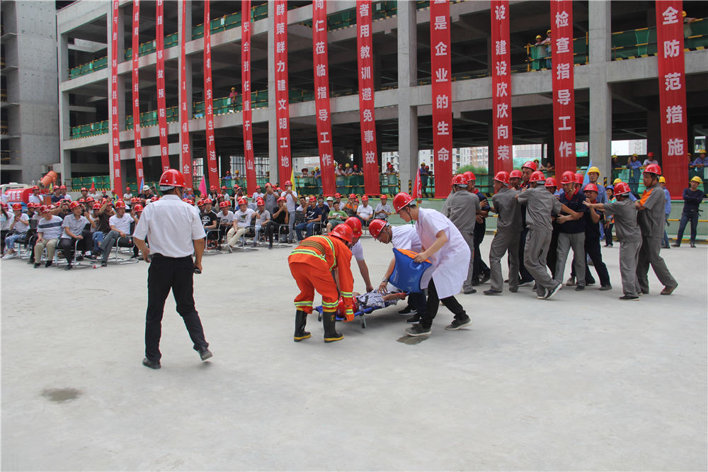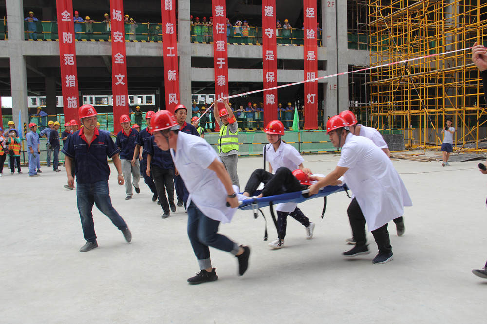 上午10:00整,隨著公司總經(jīng)理?xiàng)蠲麾暤囊宦暳钕?,演練正式開始。本次高支模腳手架坍塌應(yīng)急演練主要模擬:2#商業(yè)屋面支設(shè)模板時(shí),由于工人在架體沒有加固完成及驗(yàn)收合格的情況下擅自作業(yè),導(dǎo)致坍塌事故,造成1名作業(yè)人員從工作面墜落,1名架體加固工人被掩埋。事故發(fā)生后,現(xiàn)場(chǎng)安全員發(fā)現(xiàn)情況后立刻按照國(guó)家《生產(chǎn)安全事故報(bào)告和調(diào)查處理?xiàng)l例》及《安全生產(chǎn)法》的有關(guān)規(guī)定,向項(xiàng)目負(fù)責(zé)人進(jìn)行匯報(bào),項(xiàng)目負(fù)責(zé)人立即啟動(dòng)《應(yīng)急救援預(yù)案》,一邊組織應(yīng)急救援小組迅速開展自救,一邊向公司領(lǐng)導(dǎo)報(bào)告,并第一時(shí)間請(qǐng)求120、119等政府救援力量救援。接到險(xiǎn)情后,公司生產(chǎn)運(yùn)行部經(jīng)理張輝帶領(lǐng)公司應(yīng)急救援小組相關(guān)人員前往現(xiàn)場(chǎng),指導(dǎo)救援工作。項(xiàng)目部應(yīng)急救援小組有序展開救援,搶險(xiǎn)組迅速進(jìn)入現(xiàn)場(chǎng)清理雜物,排查危險(xiǎn)源防止二次傷害發(fā)生;疏導(dǎo)組疏導(dǎo)事故周邊交通,指引救援車輛進(jìn)入事發(fā)現(xiàn)場(chǎng);醫(yī)療組在事故現(xiàn)場(chǎng)對(duì)一名傷員進(jìn)行了緊急救助,并將傷者移往安全地帶,隨即趕來的119、120人員,營(yíng)救了傷勢(shì)嚴(yán)重的另外一名工人;警戒組第一時(shí)間在現(xiàn)場(chǎng)設(shè)置了警戒線,維持現(xiàn)場(chǎng)秩序;調(diào)查組進(jìn)入事發(fā)現(xiàn)場(chǎng)對(duì)此次事故發(fā)生的原因展開調(diào)查,收集資料,模擬演練完畢。